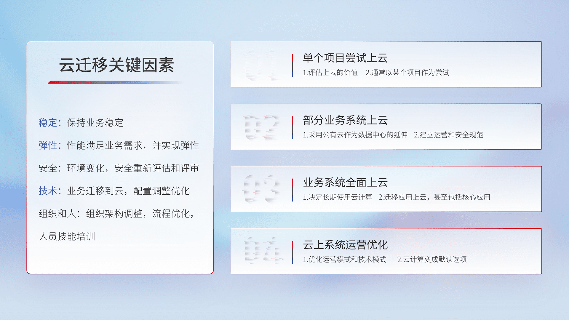 结合实际业务,,,,从规划设计、、、云平台选型、、、、云原生改造、、数据迁移、、集成交付,,,迁移全过程为客户识别最佳上云路径,,做好风险识别管理,,,,设计网络架构、、身份权限、、、、安全审计合规、、、操作审计、、日志审计、、、监控告警策略、、、多站点容灾设计等,,对云上基础设施进行整体规划,,提升IT治理水平,,,,以满足弹性、、高可用、、、、高性能的需求。。。。