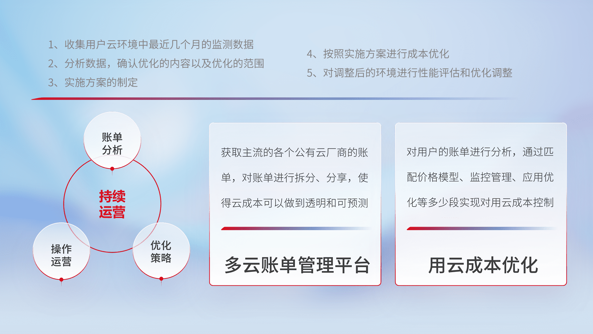 通过多云纳管,,,以统一的资源数据模型把客户的云资源进行抽象和封装,,进而实现对多云资源的统一操作,,保障云资源管理的可靠性、、、稳定性与可用性。。。。量身定制化运维内容,,配置、、、开发运维、、补丁管理、、、备份、、监控、、、认证和访问管理、、、审计和日常巡检等,,,保障在用云过程中的可靠度,,,,稳定度以及高可用率。。。。